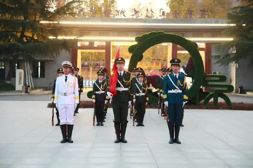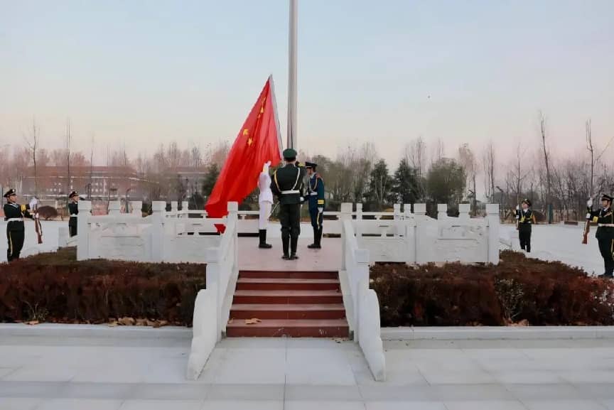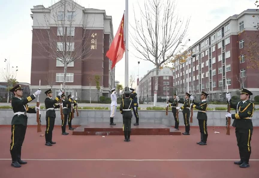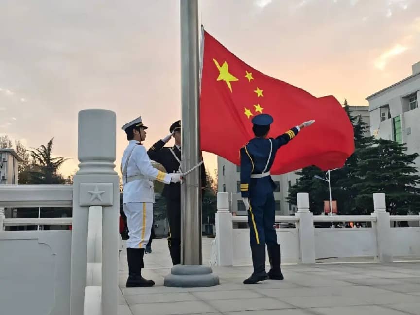 晨光熹微,校国旗护卫队方阵以昂扬的姿态、挺拔的身姿和坚定的信念,在响亮的口号声中列队向前护送国旗入场。随着奏响国歌,五星红旗冉冉升起,全体师生肃立,行注目礼,共同定格这一兼具仪式感与教育意义的重要时刻。