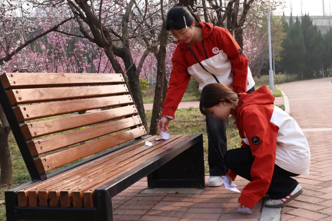 同学们将公园里的垃圾进行捡拾,细致清理草坪、步道与花坛里的烟头、纸屑、塑料瓶等各类废弃物,不放过任何一处卫生死角,用实际行动守护园区的绿意盎然。