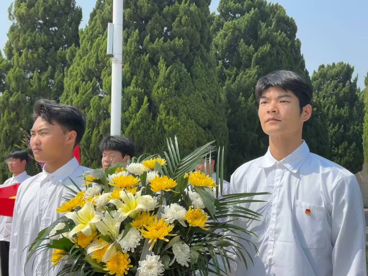 祭扫仪式在雄壮激昂的《义勇军进行曲》中拉开帷幕。全体师生面向烈士纪念碑整齐列队,庄严肃立,齐声高唱国歌。国旗护卫队迈着铿锵有力的礼步,将花篮缓缓敬献至纪念碑前,缎带轻垂,寄托着对革命英烈的无限哀思。