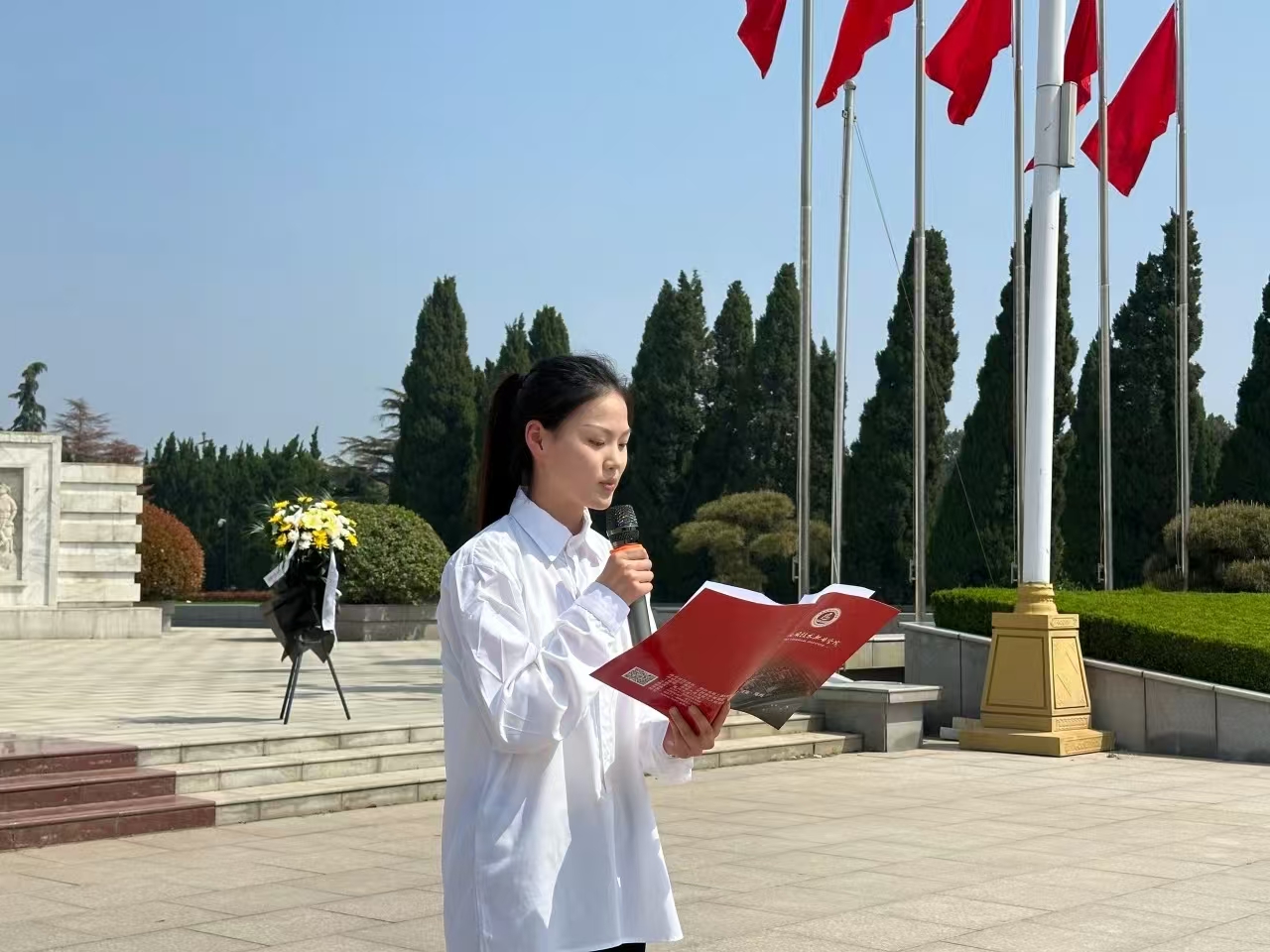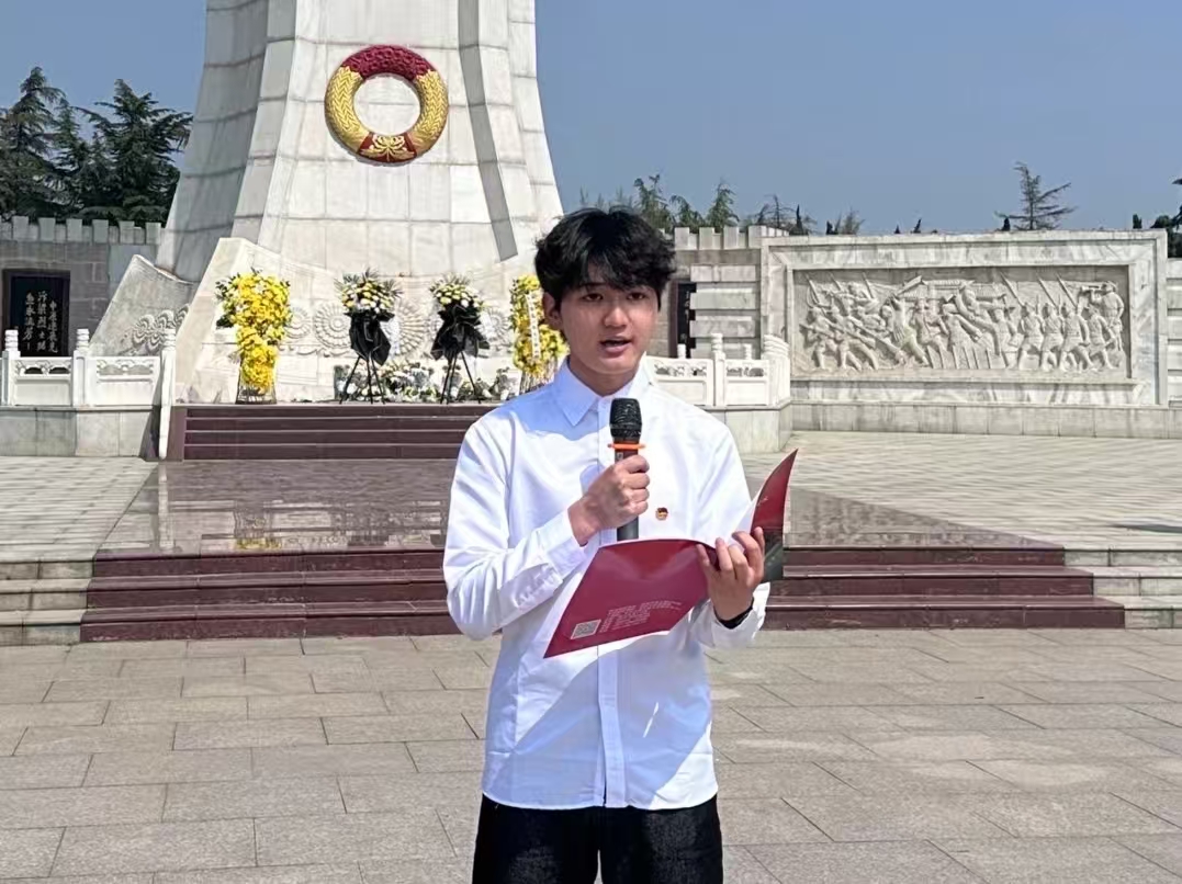 学生代表刘安心饱含深情宣读祭文,字字恳切、句句真挚,回溯革命先烈为民族独立、人民解放浴血奋战的峥嵘岁月,诉说着新时代青年对英烈的追思与敬仰,更许下传承英烈精神、勇担时代使命的坚定誓言。